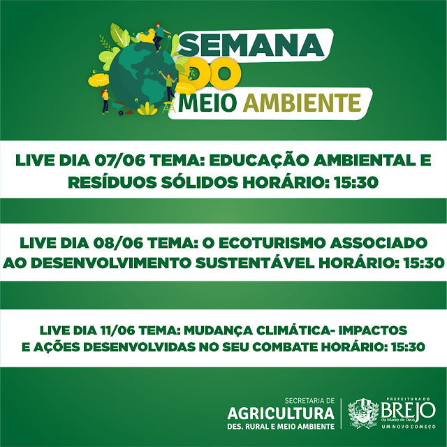 A Secretaria de Agricultura, Meio Ambiente e Desenvolvimento Rural de Brejo da Madre de Deus promoverá a Semana do Meio Ambiente, originalmente o momento é vivenciado na primeira semana de junho mas, em virtude do feriado do Corpus Christ, a pasta mudou seu cronograma para 07 a 11 do mesmo mês.