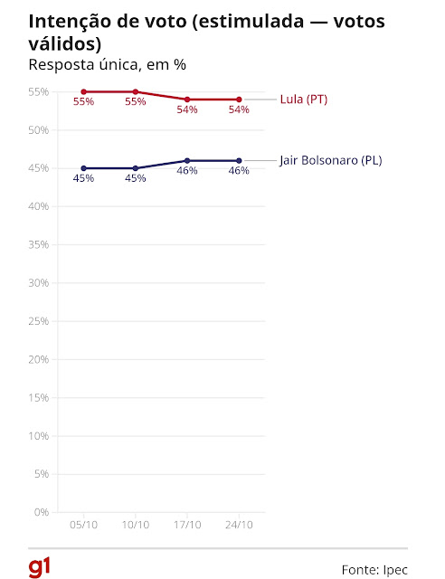 Na pesquisa anterior do Ipec, divulgada dia 14 de outubro, os resultados foram iguais: Lula tinha 50%; Bolsonaro, 43%. Havia 5% de brancos e 2% de nulos.