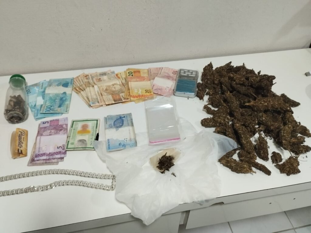 Durante a abordagem, Kaike da Silva foi identificado e revistado pelos policiais. Ao ser questionado, ele admitiu que havia entorpecentes no imóvel. No local, foram encontrados dois recipientes de vidro contendo aproximadamente 250 gramas de maconha, além de uma balança de precisão, papelotes, embalagens para comercialização e R$ 1.066,00 em dinheiro.