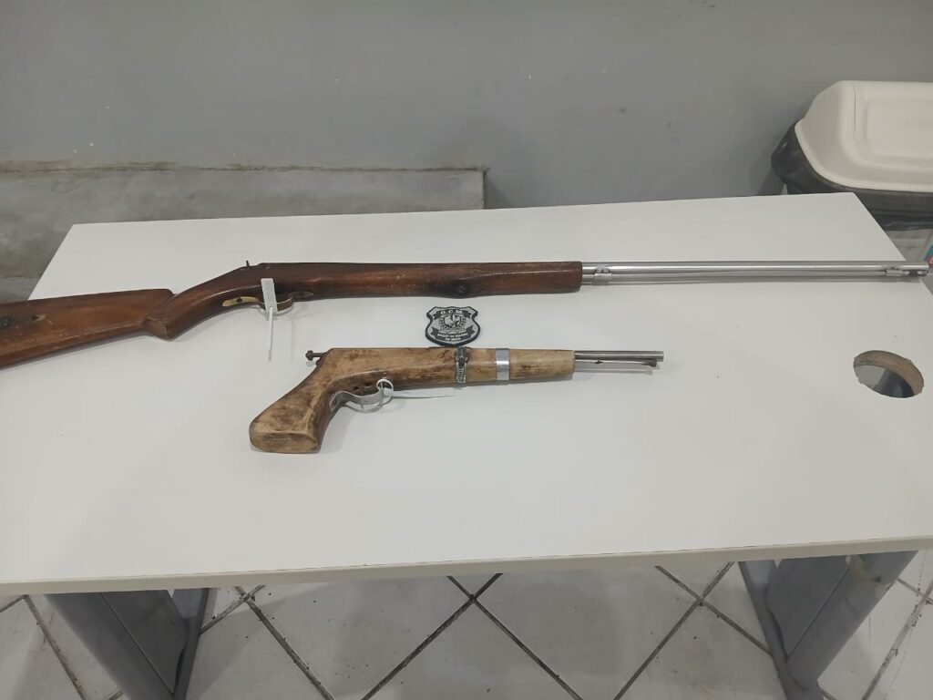 A Guarda Civil Municipal de São Domingos apreendeu duas armas de fogo após receber denúncias sobre a presença de entorpecentes e armamento em uma residência no Sítio Navio, na zona rural de Brejo da Madre de Deus.