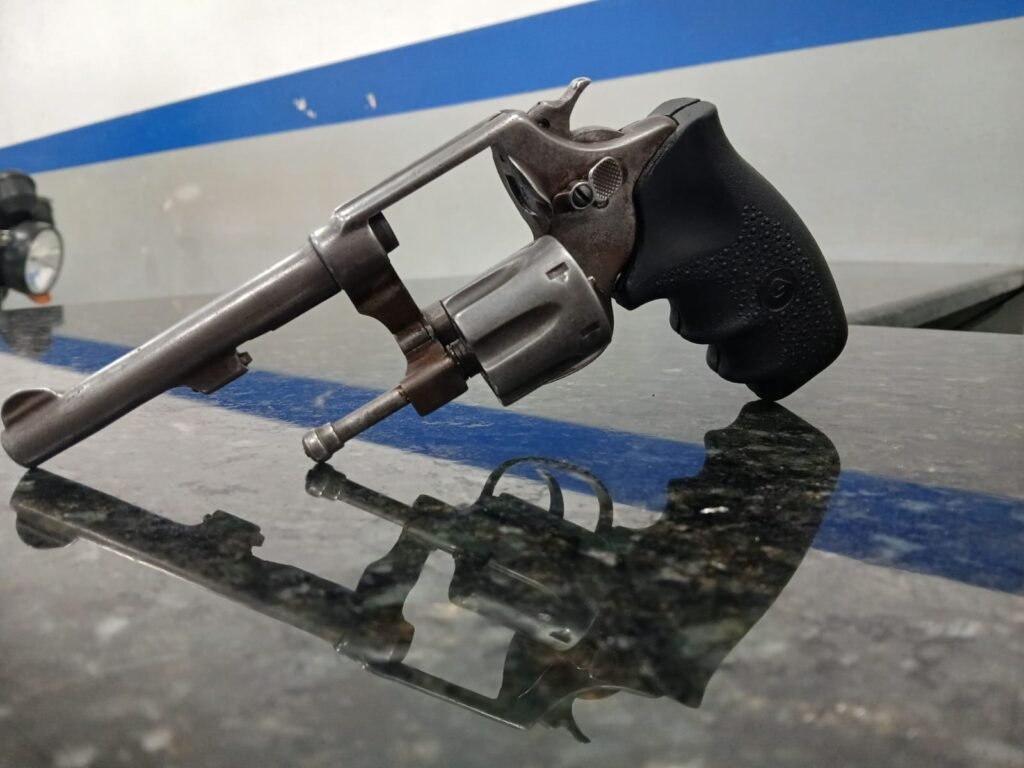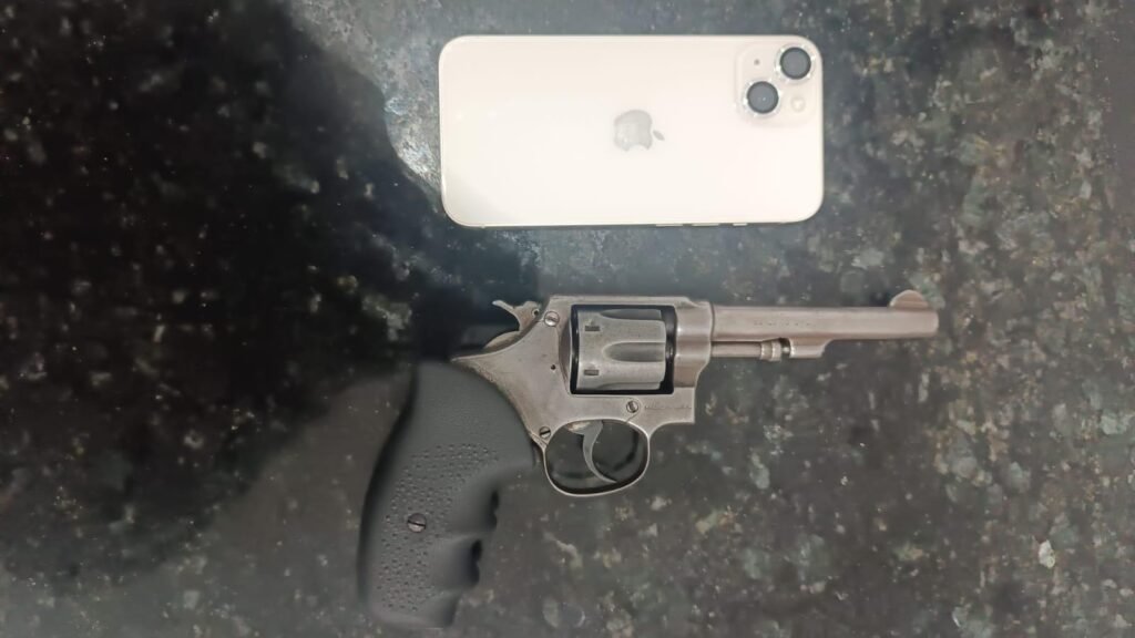 O celular foi localizado em um terreno baldio, na Rua Colômbia, no distrito de São Domingos. Já a arma utilizada no assalto, um revólver calibre 32, foi encontrada posteriormente guardada em uma caixa de sapatos na residência do suspeito.